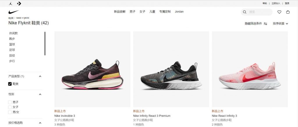 上图:Nike 官网在售的、采用 Flyknit 技术的部分鞋款