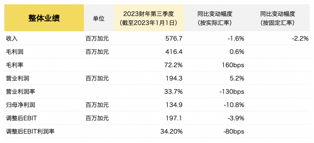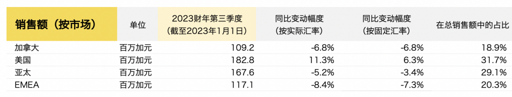截至2023年1月1日,Canada Goose 2023财年第三季度的主要财务数据如下: