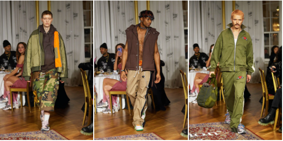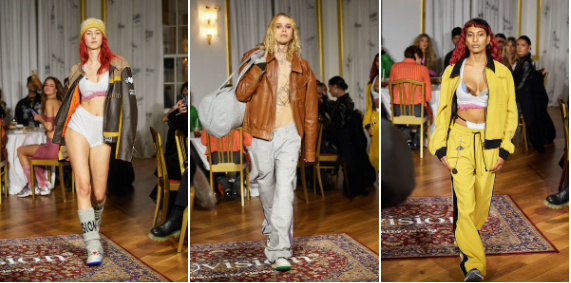 创立于2018年的丹麦设计师品牌 (di)vision 以“从已存在的东西中创造”为理念,擅长从经典廓形中汲取灵感。(di)vision 将秀场布置成一个派对过后的餐厅,面包屑、未喝完的酒杯和烟头铺满了每张桌子,观众则坐在餐桌边看秀。(di)vision 2023秋冬系列“Dressed for Disaster”以运动服、飞行员夹克和带有品牌logo的毛衣为主要特色,货车帽、暴露的内裤、阔腿裤、牛仔裤腿套等单品展现出浓烈的Y2K风格。
