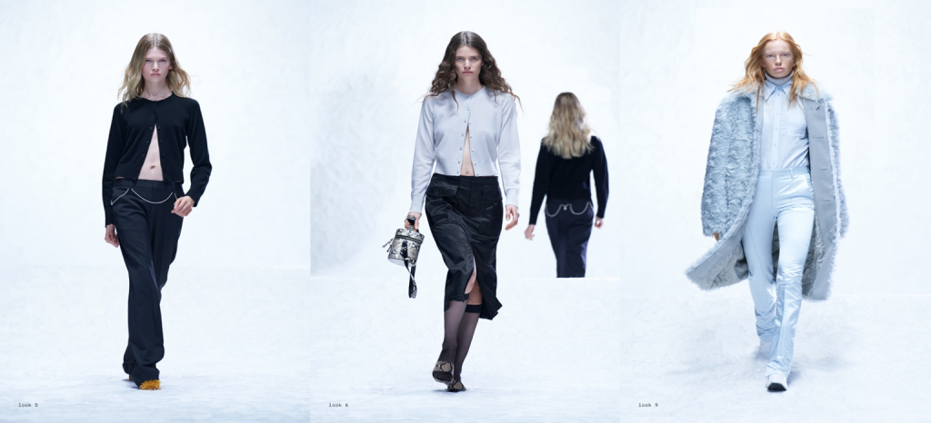 丹麦时尚品牌 Ganni 本季使用了全新的蝴蝶标识,寓意破茧成蝶。设计师 Ditte Refstrup 在本系列中强调剪裁结构,从灰色套装到蓝色短裙,都突出袖子的弧线和腰线。在可持续方面, Ganni 本季使用了品牌最新的替代皮革Ohoskin,这种皮革由食物和美妆行业中的橘子和仙人掌废料制成。