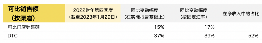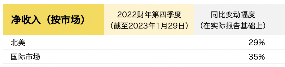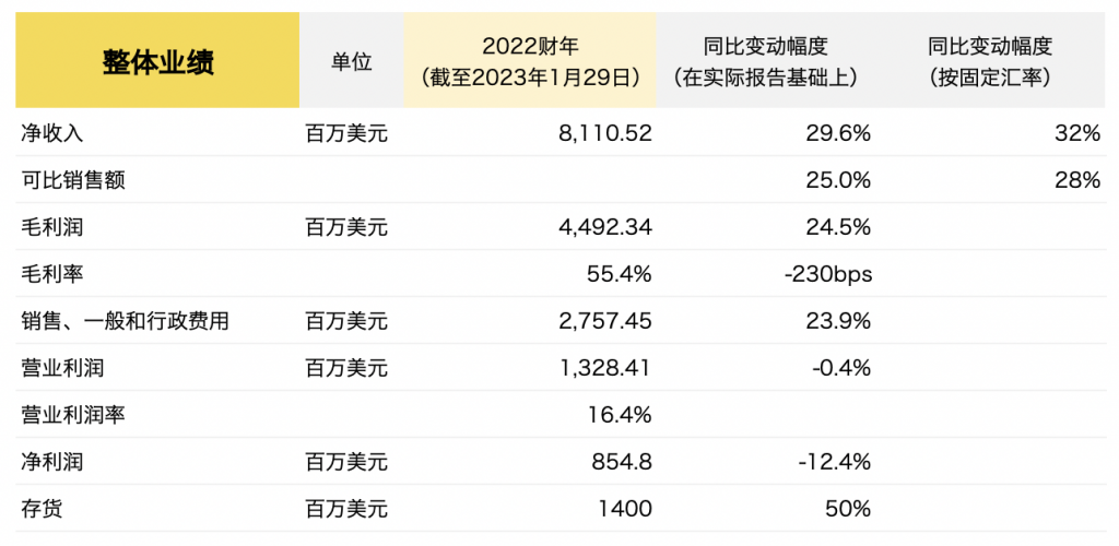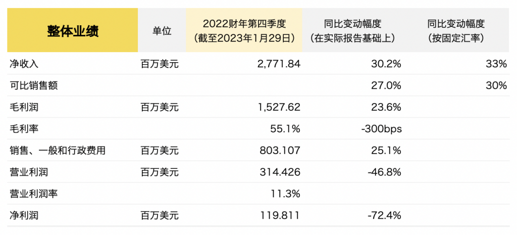 截至2023年1月29日,lululemon 2022财年第四季度的主要财务数据如下:
