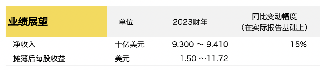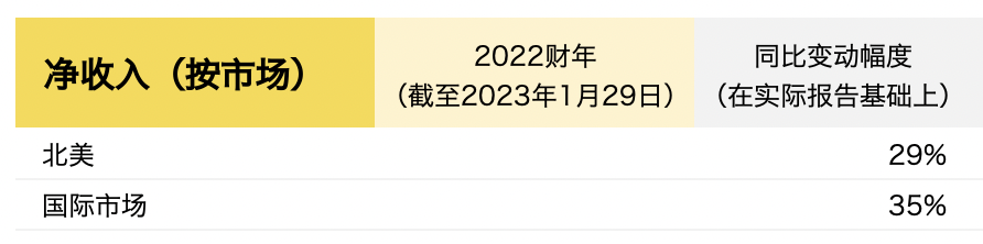 基于此,lululemon公布了2023财年业绩展望,预计2023财年净收入增长15%达到93-94亿美元: