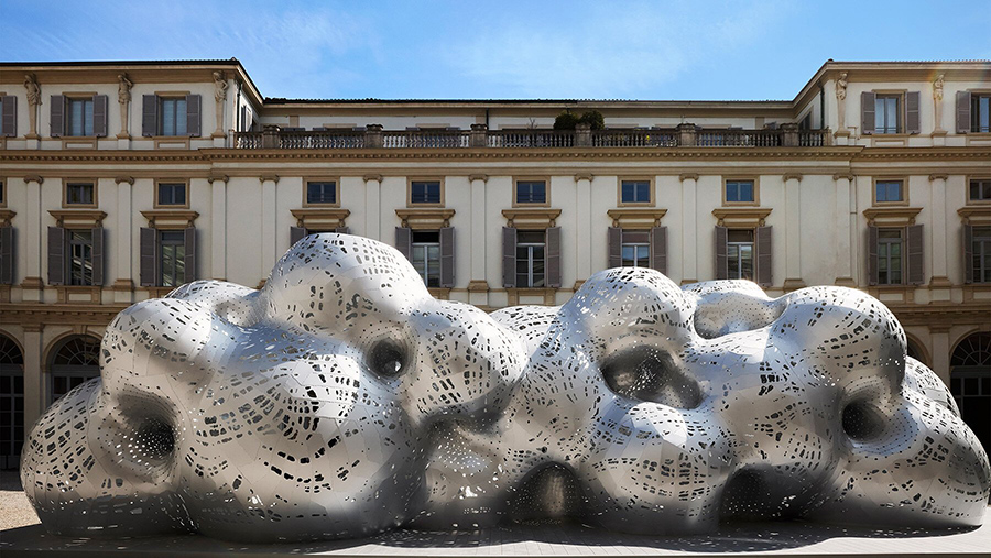 延续多年传统,LV 继续带来旅行展馆,今年的设计出自建筑师 Marc Fornes 之手。这一珊瑚状的结构是 Marc Fornes 签名式的设计语言,整个建筑由 1600 张超薄的阳极氧化铝板制成,如同外星生物般漂浮在庭院中。