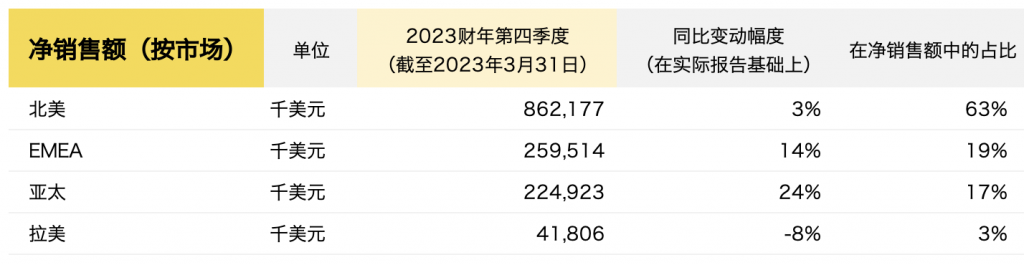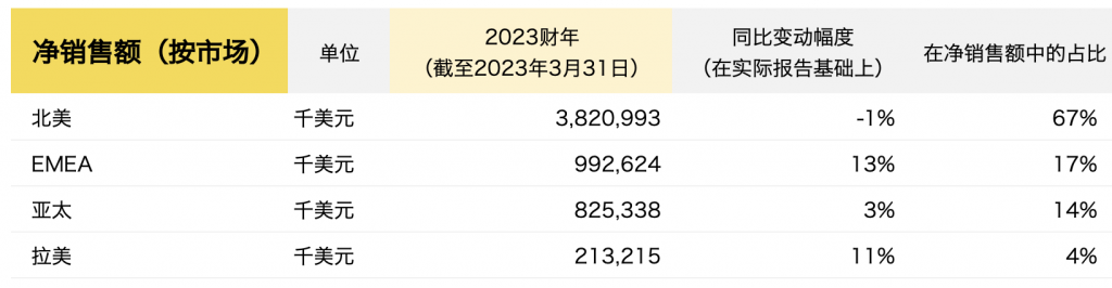 (截至2023年3月31日)2023财年全年净收入同比增长3.1%至59亿美元,撇除汇率影响后增长6%。