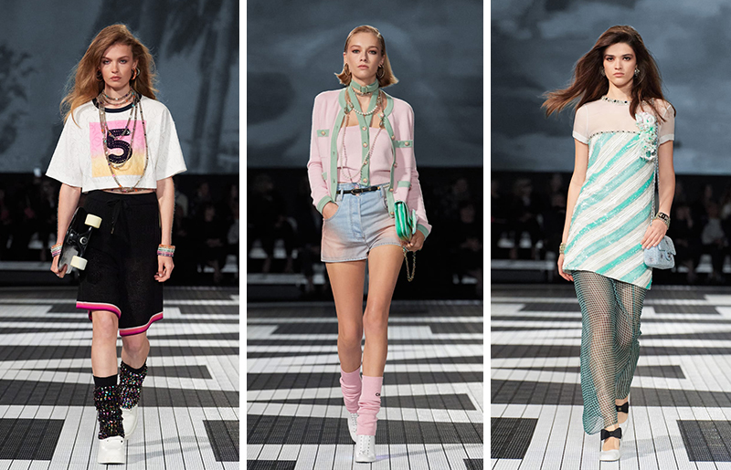 在建构美以及美好生活方式的标准上,好莱坞有它的话语权。在“天使之城”,维吉妮·维娅找到了复古回潮和健康美这两股趋势的交汇点。从和洛杉矶有着千丝万缕联系的轮滑和冲浪运动中汲取灵感,将其置于这座城市标志性的柔和日落色调中,再撒上好莱坞华丽的亮片,构成了这个系列动感活力又极尽浮华的风格。