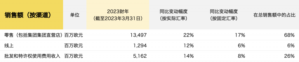 本财年中,奢侈品电商YNAP 的业绩计入“已终止业务的业绩”。“对于‘纯数字分销商’来说,在全球充满挑战的环境中,YNAP 按实际汇率计算,销售额同比增长4%。 NET-A-PORTER 和 MR PORTER 在英国和美国以高个位数的销售额增长,而 YOOX 在欧洲和美国的良好表现,未能完全抵消俄罗斯市场业务的中断。”