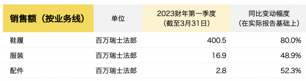 瑞士运动品牌 On(昂跑)公布2023财年一季度关键财务数据:在正常化的运营环境和持续的品牌势头支持下,净销售额同比大增78.3%达到创纪录的4.202亿瑞士法郎,超出预期。与此同时,盈利能力也大幅提升,净利润与调整后EBITDA增长超200%,分别达到4440万和6100万瑞士法郎。