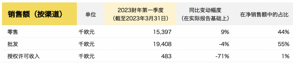Marimekko零售销售额在第一季度增长了9%,实体店和线上销售额都有所增长;由于芬兰市场的批发销售额受消费者需求疲软的影响而下降(-20%),批发销售总额下降了4%。