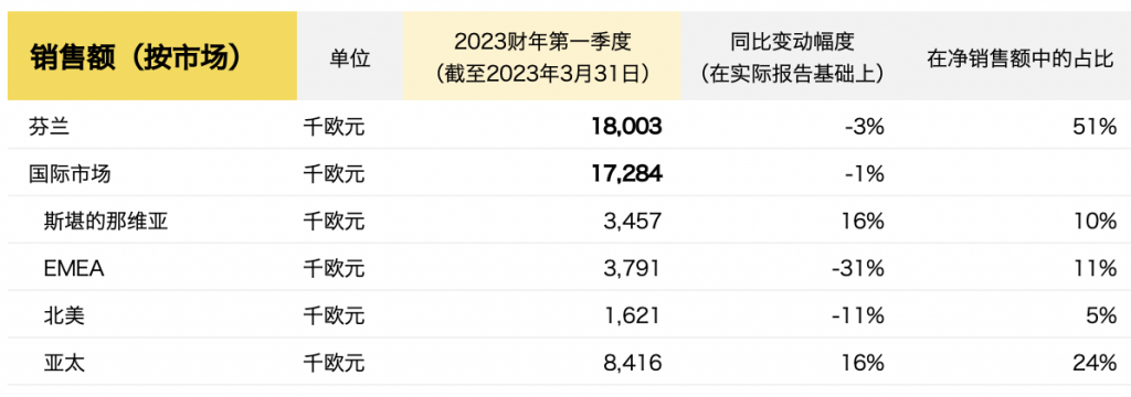 截至2023年3月31日,Marimekko第一季度的主要财务数据如下: