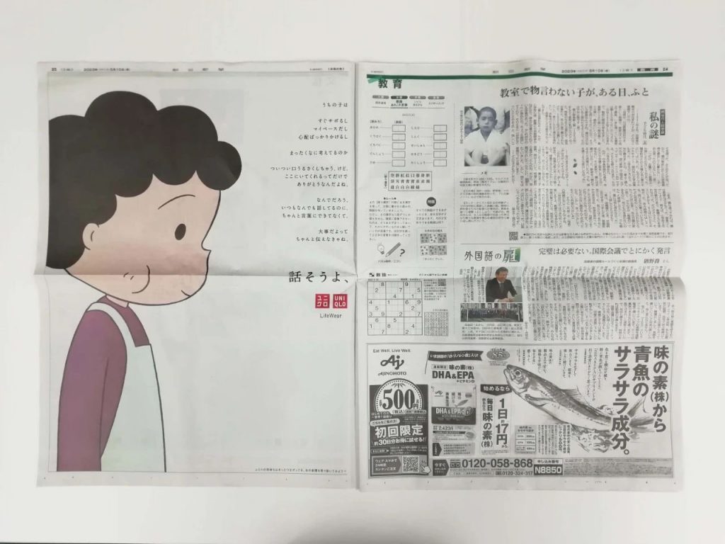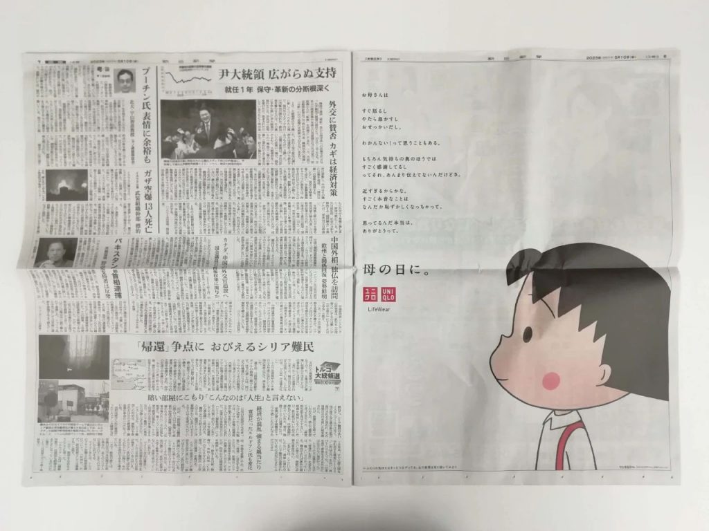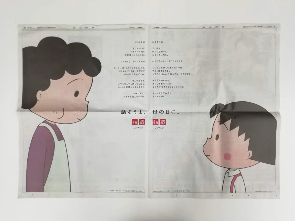 刚过去的母亲节,优衣库在《朝日新闻》上投放的母亲节报纸广告在日本引发了共鸣和讨论,优衣库买了两个版面,当中分别是樱桃小丸子和妈妈,设计也很简单:两个人看向对方,同时旁边的文字是两个人心里想说的话。