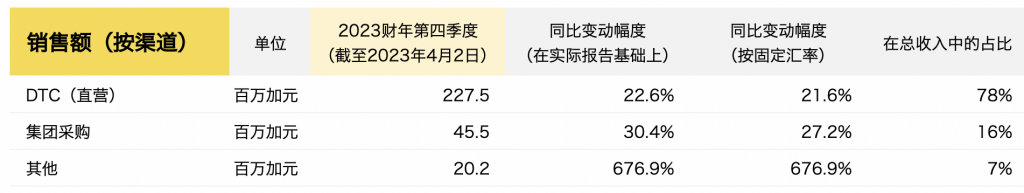 由于DTC收入的增加,加拿大、EMEA和亚太地区的收入与上季度相比有所增加。疫情结束后亚太地区的重新开放,以及DTC和集团采购渠道在EMEA地区的强劲增长,都对业绩产生的积极的影响。