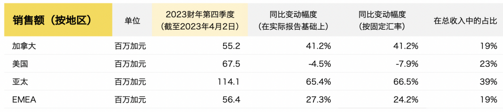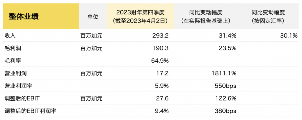 截至2023年4月2日,Canada Goose加拿大鹅第四季度的主要财务数据如下: