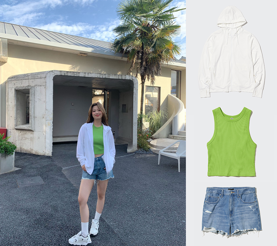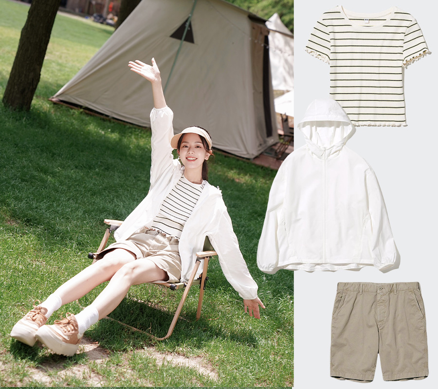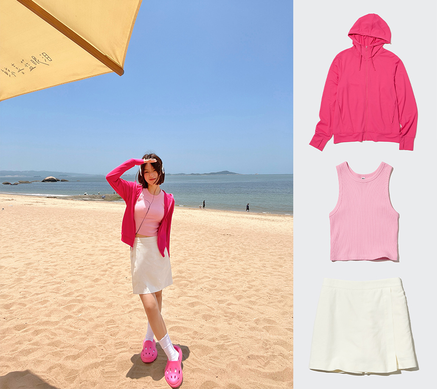甚至还可以用防晒衣来打造这个夏天大火的 Barbiecore。芭比粉是 Barbiecore 风格的灵魂,优衣库本季的防晒衣和辣妹 T 都有亮眼的粉色调可选。