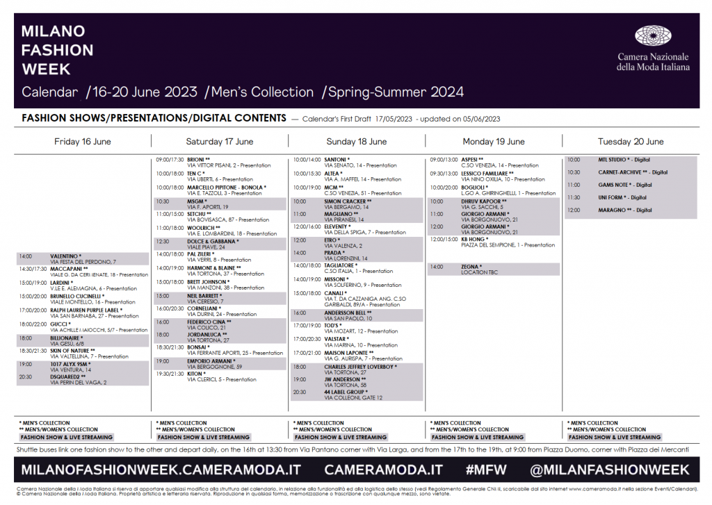 附2024春夏米兰男装周官方日程表: