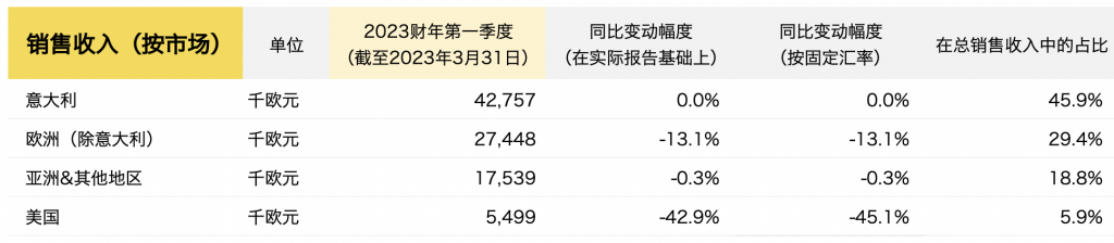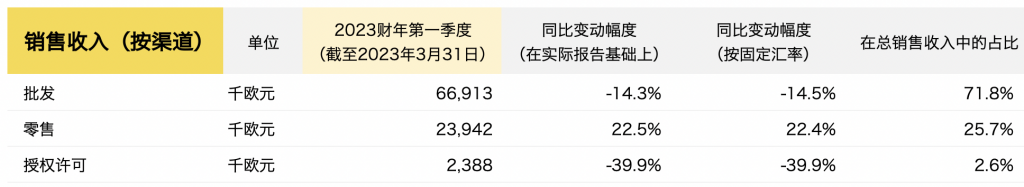 欧洲(除意大利):由于伦敦Moschino精品店闭店翻新,零售渠道下降了11%(翻修工程于2023年3月完成);