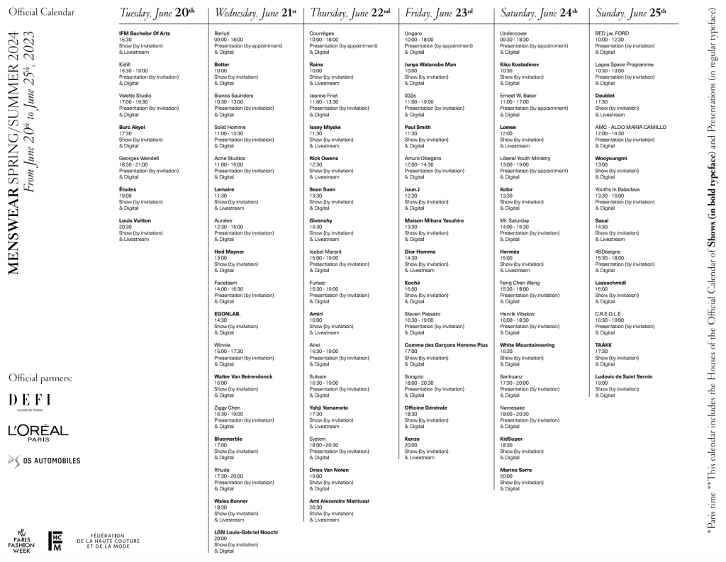 法国高级定制和时装联合会 (France’s Fédération de la Haute Couture et de la Mode)公布了2024春夏巴黎男装周的日程安排。