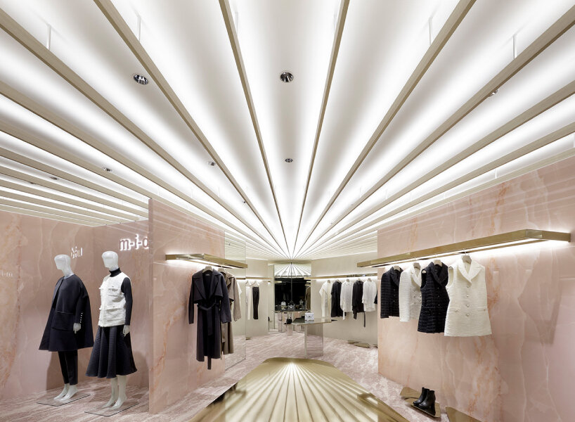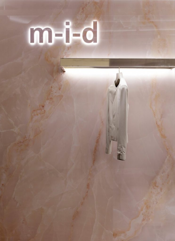伴随着光芒四射的太阳光照明,CURIOSITY还选择了粉红色的玛瑙材料,以柔化m-i-d概念店内的照明光线。柔和的宝石色泽被转化为一块巨大的板块,分割了商店的空间,而其余的部分则转化为地毯纹理铺满了整个概念店的地板。工作室将粉色玛瑙的使用描述为欢迎优雅、庄重、成熟的横滨顾客的一种手段,通过天花板上闪亮的金属横梁和粉色的柔和色调的融合,唤起了缓慢流动的节奏。挂衣杆隐藏在锚定在墙壁上的金属箱内,金属箱反射出出周围的景象,时刻提醒顾客店内还有更多角落等待他们前去探索。