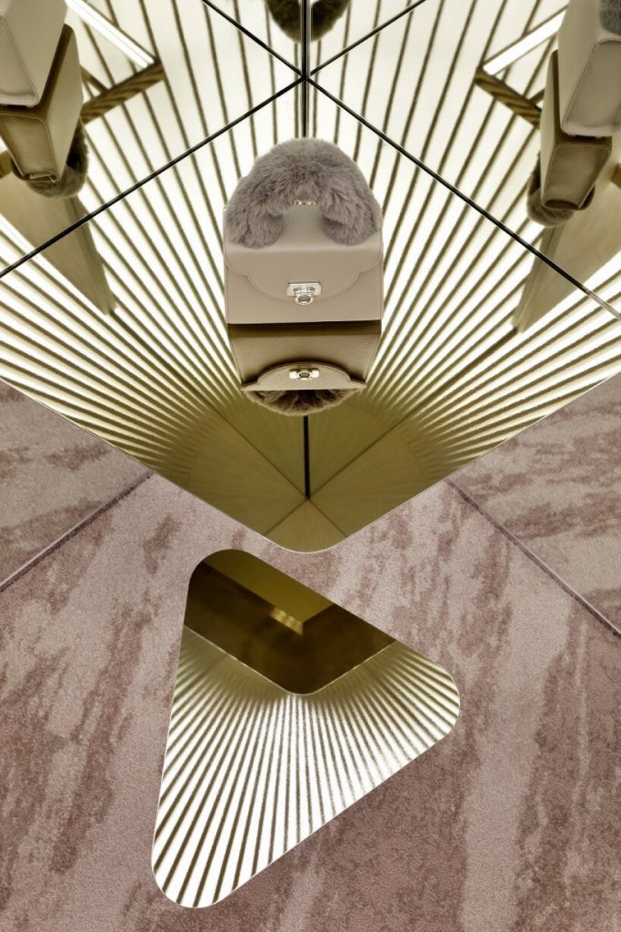 CURIOSITY通过在整个房间里放置金色的反光体,实现了放大m-i-d概念店内空间的效果。在主区域,一个吉他拨片形状的反光体映射出了天花板上的太阳光线照明,并创造出工作室也在地板上安装了横梁的视错觉。这样的设计让顾客产生错觉,但他们很快意识到这只是在引导他们的想象力,并试图阻止他们以过快的速度绕过商店。店内的软垫扶手椅也采用了柔和的粉红色,以延续粉红玛瑙的色调。得益于灯光的白色光芒和粉色阴影赋予整个空间的微妙的色彩冲击,店内陈列的来自五个不同品牌的m-i-d系列的黑白主题变得更加突出。