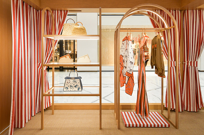 北京SKP,1 层中庭有 FENDI Astrology 2023 夏季胶囊系列限时店。整个空间的装潢以天然橡木的木质架构和红白 Pequin 条纹帆布为亮点,充满了假日海滩般悠闲惬意的气氛,同时也很有巧思地融合了拱门元素,这呼应了 FENDI 罗马总部意大利文化宫的风格。