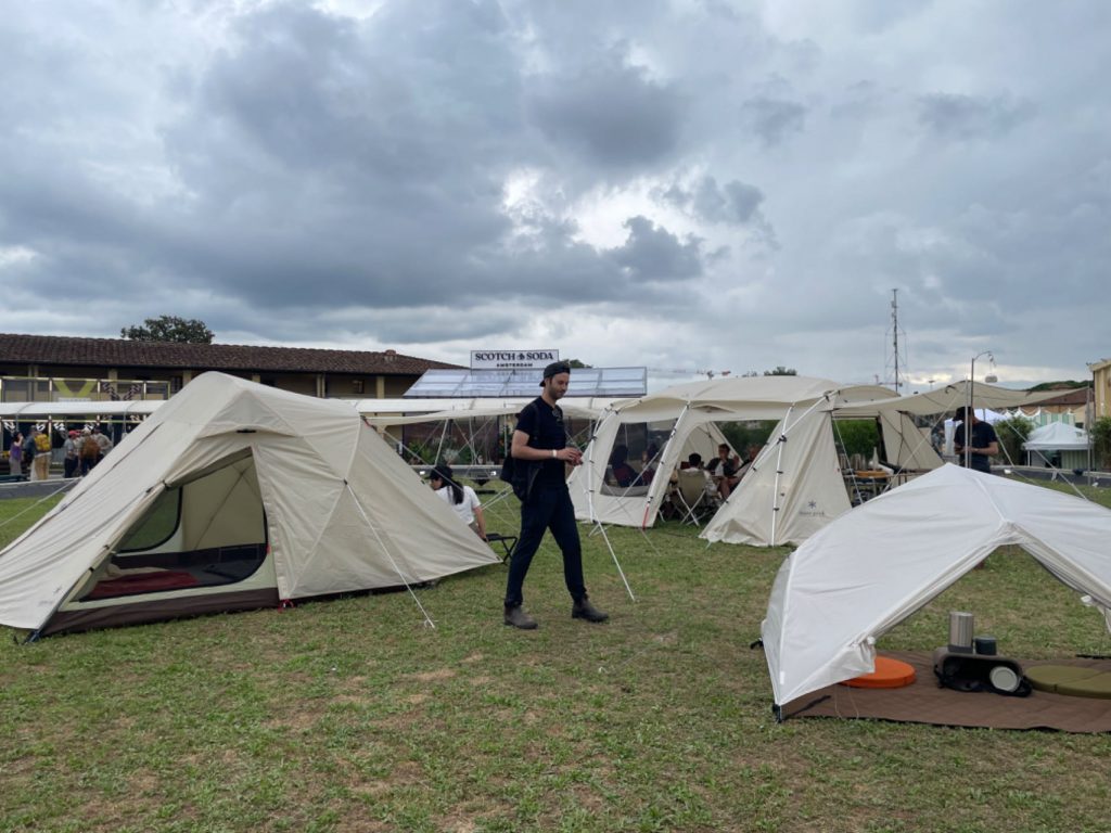 日本户外生活方式品牌 Snow Peak(雪诺必克)今年回归了「I GO OUT」户外展区,在室内室外搭建起双展台:室内展台提供 2024 年春夏服装系列预览,户外草地上则搭建了一片营地,天幕、帐篷、炊具、桌椅等户外设施一应俱全,俨然将参展变成了一场露营旅行!