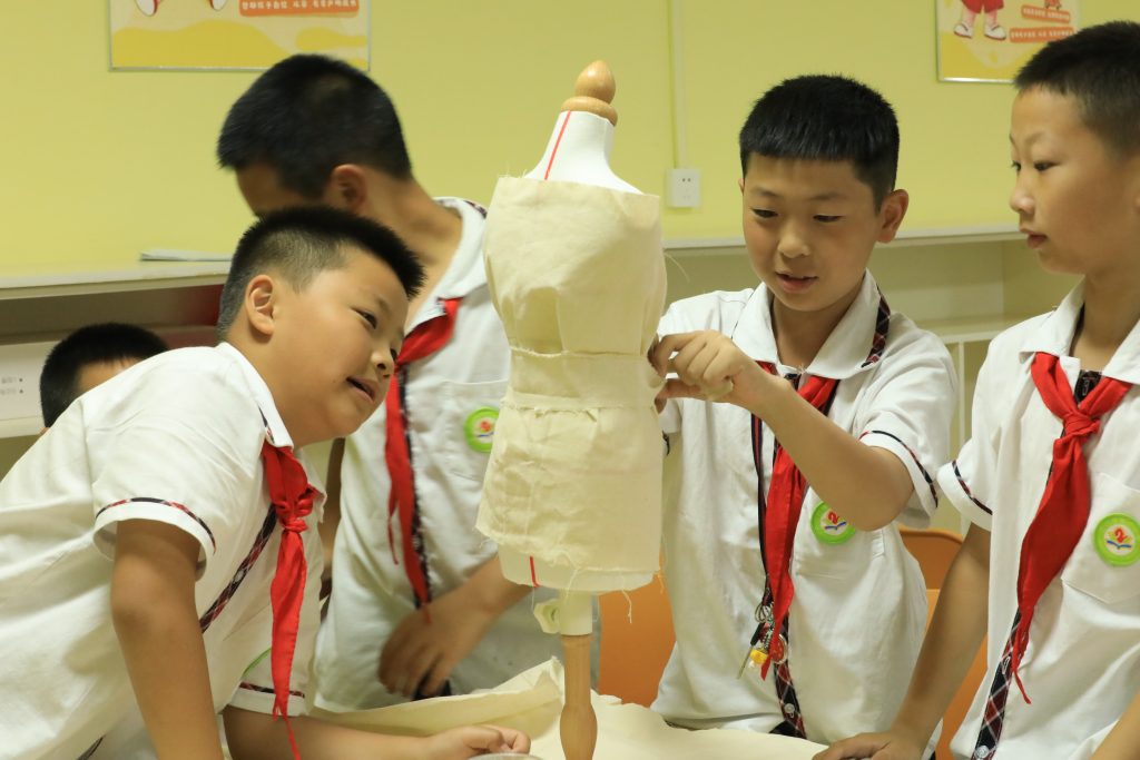 在扎染课上,有的孩子还没想好要扎成什么样的形状,就凭灵感把布一扎放进了染料盆中。当作品诞生的那一刻,所有人都被惊艳到。老师们发现,当孩子们得到自己动手的机会,积极性大大提高,在操作过程中渐渐就悟到了很多知识点。