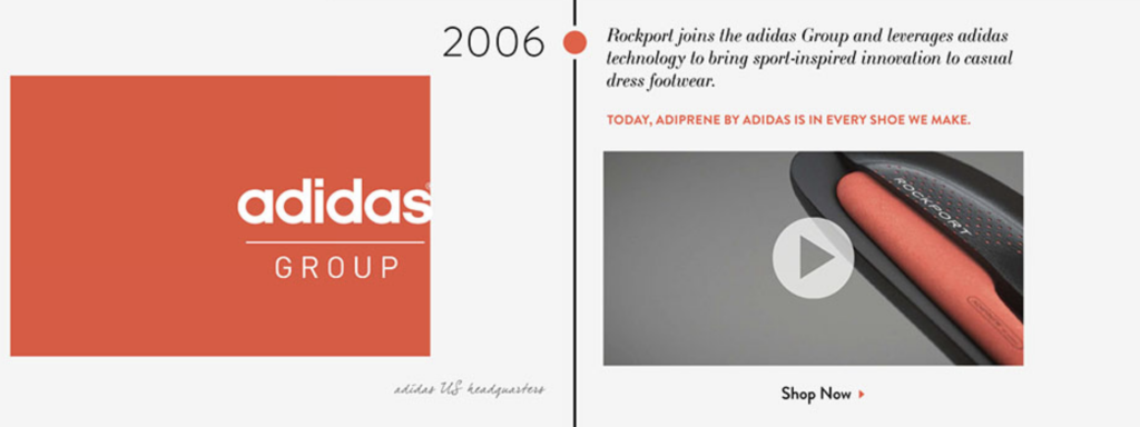 1986年,Katz 家族以1.18亿美元的价格将 Rockport 卖给了美国运动品公司 Reebok(锐步)。30多年来,Rockport 一直是 Reebok 旗下的产品组合。由于市场经营路线错误,Reebok 业绩持续下滑,于2006年被德国运动品巨头 adidas(阿迪达斯)全资收购,成为独立运营的子公司,后于2021年8月被 adidas 以21亿欧元将出售给了美国品牌管理公司ABG。
