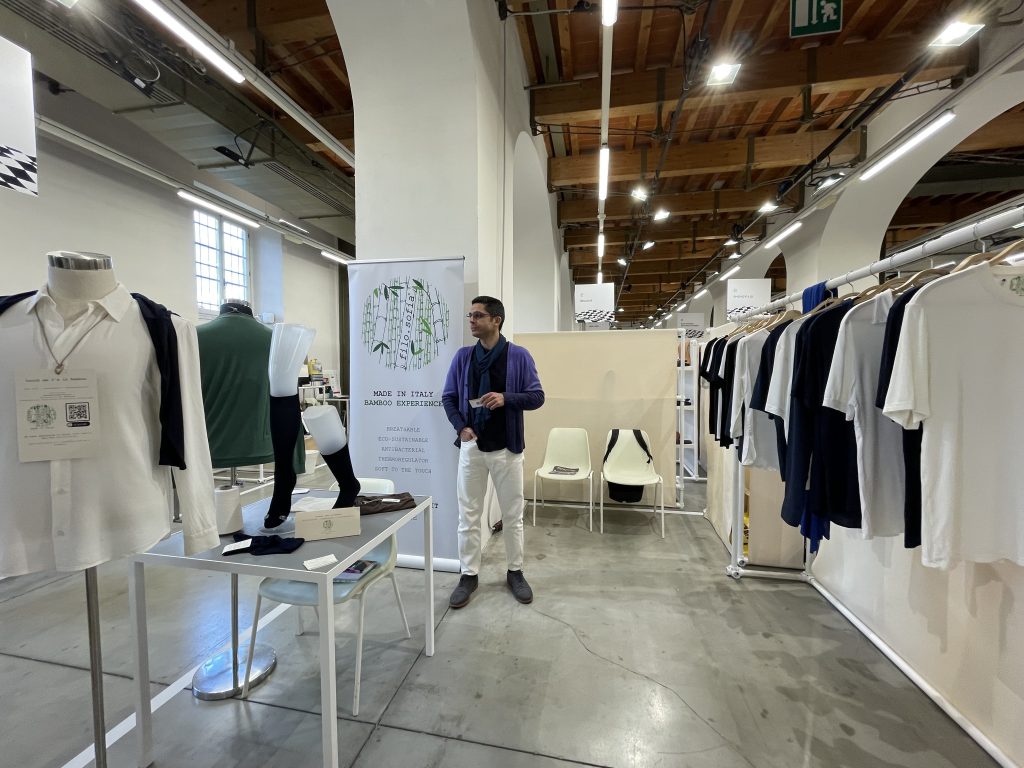 上图:Andrea Corrado 在展会现场展示以竹子为原料制作的衣物