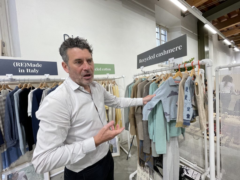 上图:Rifò 在展会现场展示的使用回收棉、羊绒等材料制作的衣物