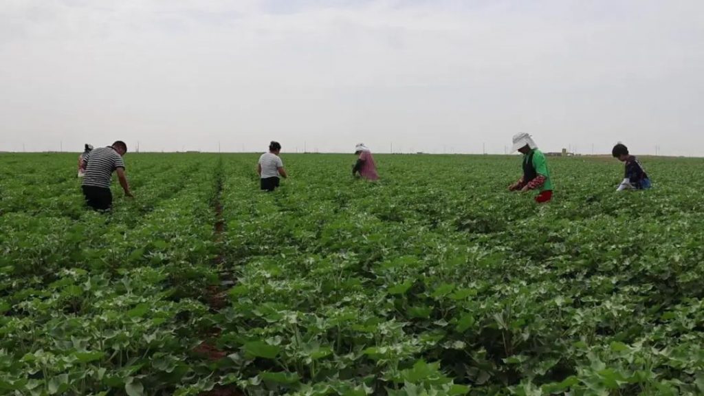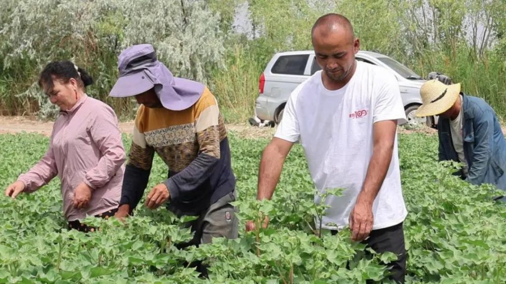 7月4日,在库车市牙哈镇守努特村,记者看到村民们正忙着为棉花打顶。棉花打顶是保障棉花丰收的关键环节,通过打顶,能够有效减少棉花营养消耗,促进棉花正常生长。