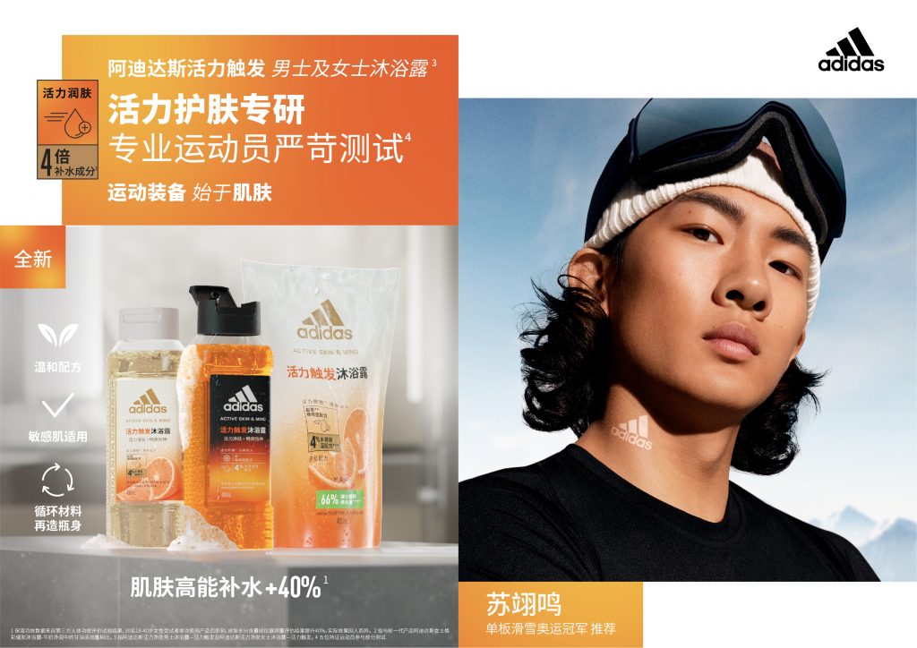 上图:为推广全新高端系列,阿迪达斯个护品牌正式官宣中国单板滑雪奥运冠军苏翊鸣为品牌签约运动员,而苏翊鸣本人自2020年起就是阿迪达斯运动装备系列的签约运动员。