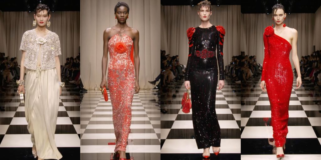 据品牌介绍,此次 Giorgio Armani 在巴黎时装周发布的新系列是一场“自西向东的旅程”,灵感来自于东方文化中的精致风格,“来自那个宇宙固有的优雅”,而体现这一风格最理想的颜色就是“漆红色(rosso lacca)”。