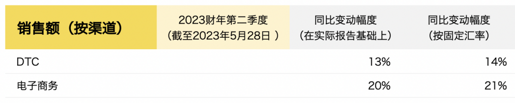 DTC:在报告基础上同比增长了13%,在固定汇率基础上同比增长了14%,这主要得益于自营门店、奥特莱斯折扣店和电子商务的广泛增长。