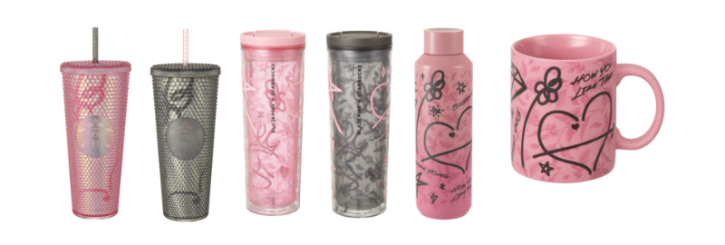 这次联名系列包括 11 款杯子(随行杯、马克杯等都有,当然也都强调了可重复使用)和 6 款配饰(手提袋、瑜伽垫、护照夹、钥匙链等),它们除了有星巴克自家的绿色,自然也包括 BLACKPINK 标志性的黑色和粉色搭配,同时设计上还融入了涂鸦图案等。