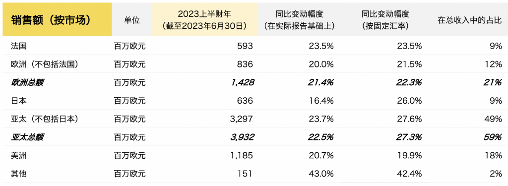 其中,受美国市场持续增长和中国市场急剧加速的提振,第二季度销售额加速增长——按固定汇率计算,销售额同比增长27.5%至33.2亿欧元,高于分析师预期的22%,所有地区都实现了两位数增长。