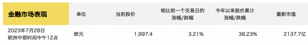 财报发布后的7月28日,截至欧洲中部时间中午12点(北京时间晚6点),爱马仕股价已较上一交易日上涨了3.21%,当前市值约为2137亿欧元。今年以来,集团股价已经累计上涨逾38%。