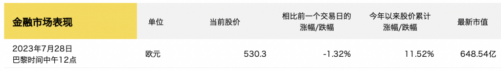 财报发布后的第二天,截至7月28日当地时间12点(北京时间晚6点),开云集团股价较上一交易日下跌1.32%,当前市值约为648亿欧元。