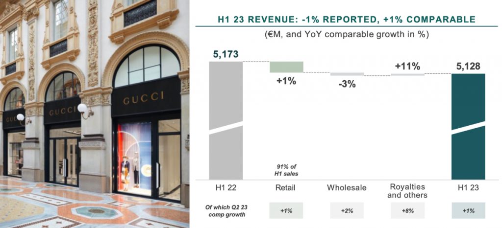 2023年上半年,Gucci的营业额达到51亿欧元,在报告基础上同比下降1%,在可比基础上增长1%。其中,直营店网络的销售额在可比基础上增长了1%;批发收入在可比基础上下降了 3%。