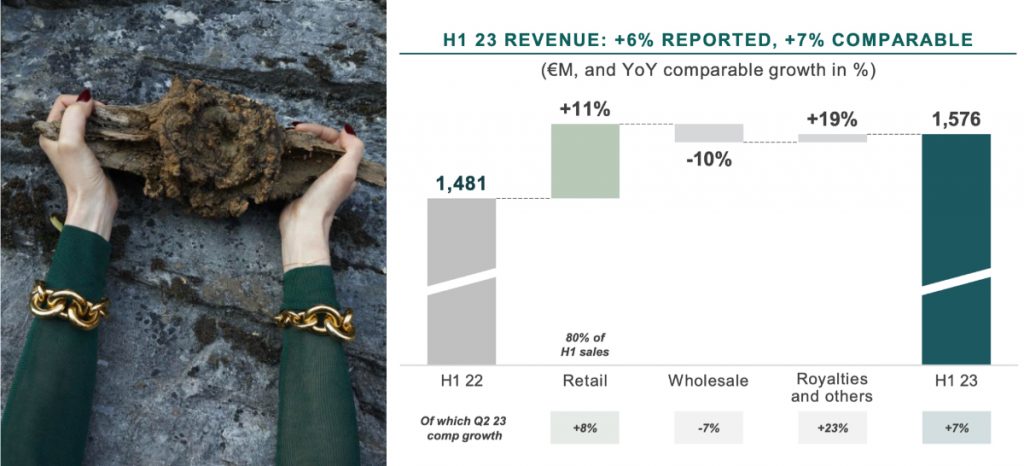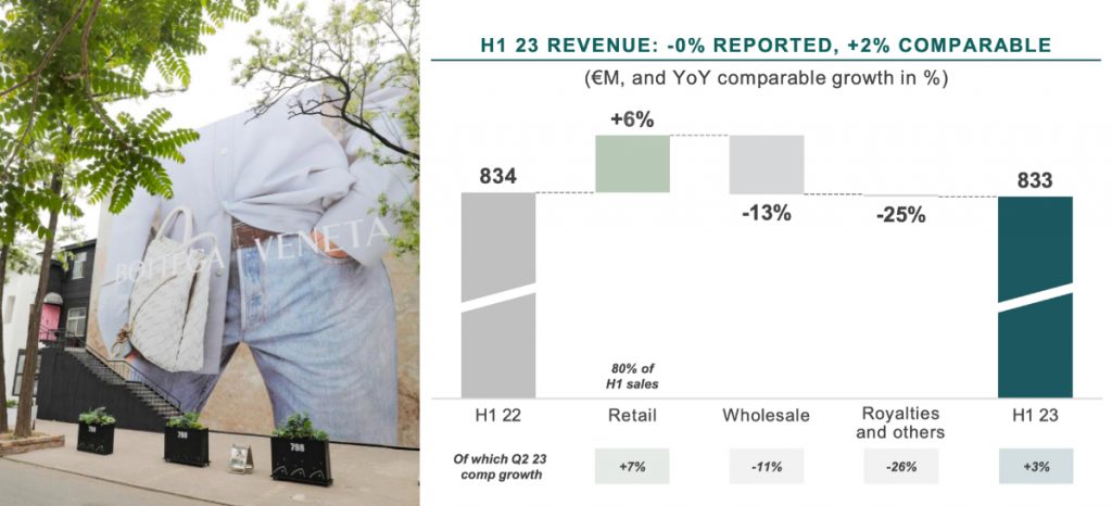 在直营店网络(+7%)健康增长的推动下,Bottega Veneta 2023 年第二季度的销售额在可比基础上增长了 3%。