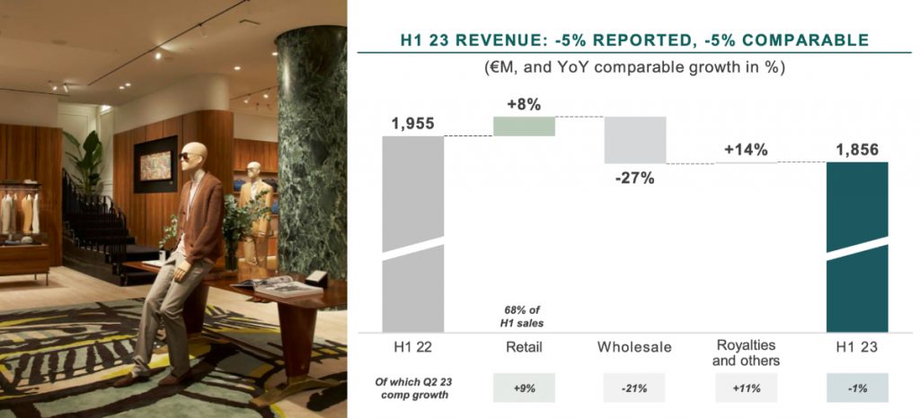 2023年上半年,集团其他品牌的销售总额为 19 亿欧元,在报告和可比基础上均录得5%的同比下降,但第二季度比第一季度有显著改善。就渠道来看,直营店网络势头强劲,销售额在可比基础上增长了8%。批发收入下降了27%,主要是由于所有品牌都在追求精简渠道的策略,同时也反映出美国市场的喜忧参半。