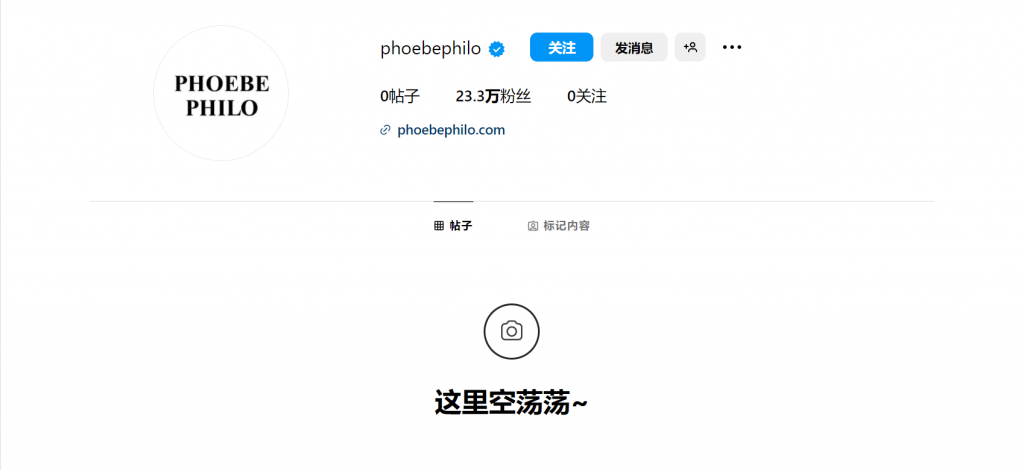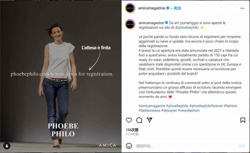 今年2月,Phoebe Philo 的个人品牌开通了官方 Instagram 账号,第一条帖子就宣布品牌将在9月正式推出,官网将于7月开放注册。虽然该贴也在发布后不久被删除,但当时品牌 Instagram 粉丝数已超过14万人。