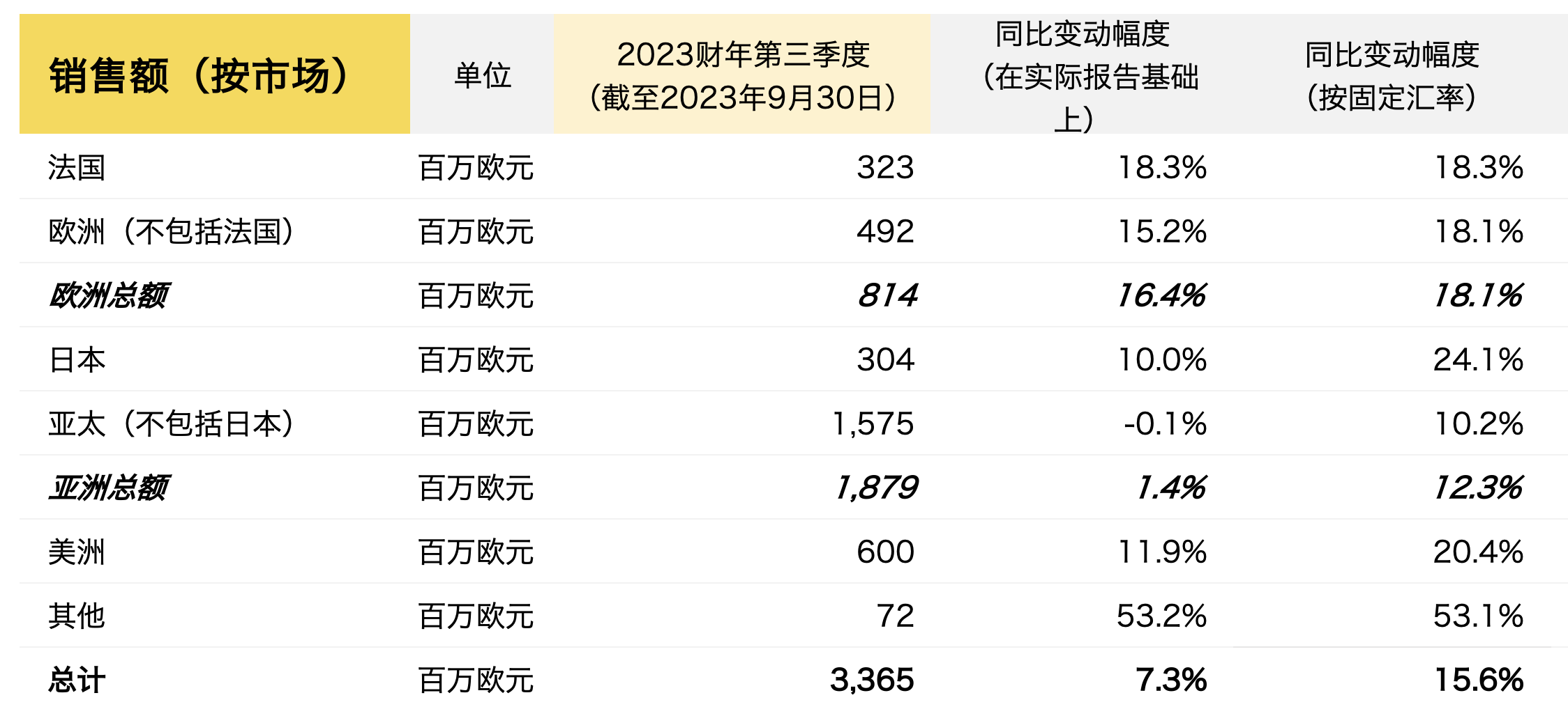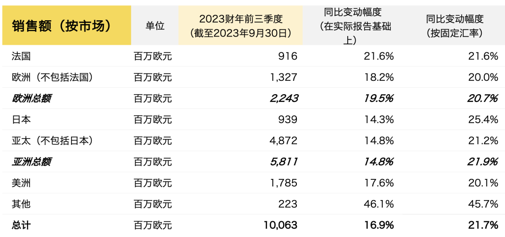 不过,第三季度的同比增长主要由美国(按固定汇率计+20.4%)和日本(按固定汇率计+24.1%)两大市场所推动。该季度,以中国为首的亚太区(不包括日本)的同比增幅为 10.2%(按固定汇率计),明显低于其他地区。