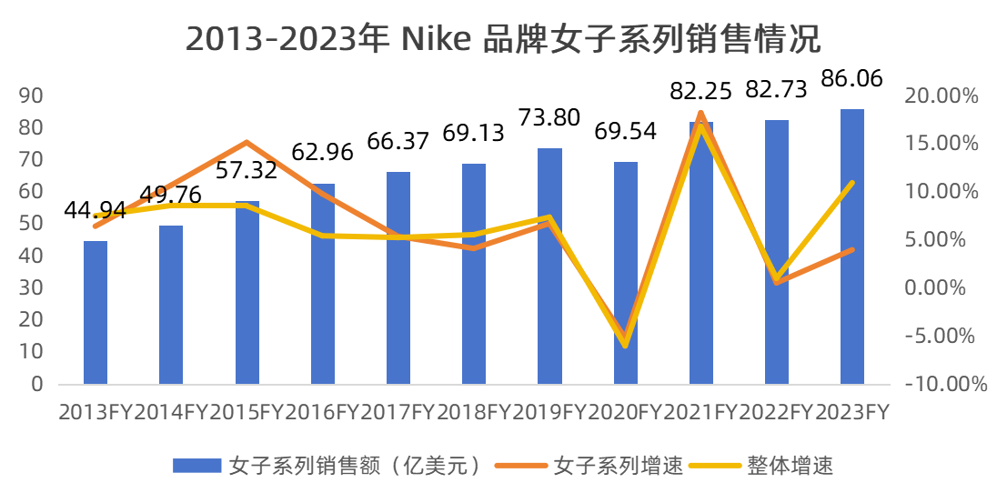 过去十年,以批发业务为基础来计算,Nike 女子系列销售额累计增长91%,高于整体增速(+83%)与男性业务的增速(+59%)。