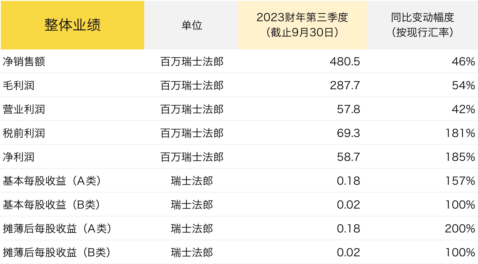 此外,品牌前三季度净销售额同比增长57.2%达到13.45亿瑞士法郎,净利润同比增长26.4%至1.063亿瑞士法郎。