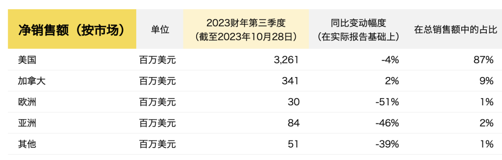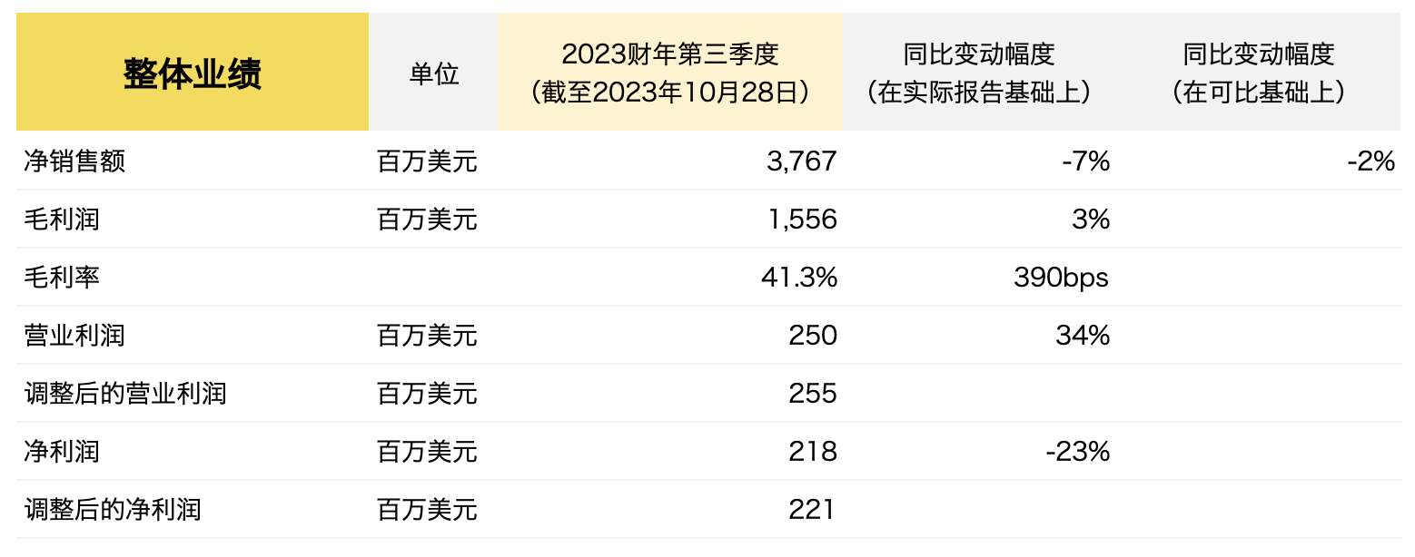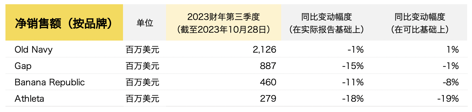 截至10月28日,Gap 集团2023财年第三季度关键财务数据如下: