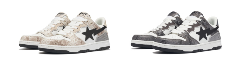 BAPE SK8 STA 两款蛇纹元素版本正式发售,鞋款延续了经典鞋型设计,并以牛皮和麂皮打造鞋身,在黑白两色的基础上鞋款分别采用了浅褐、深灰两款仿真蛇皮效果的处理,带来了优雅风格和异域格调的碰撞。