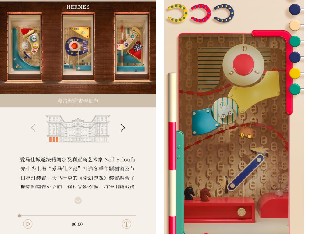 法国奢侈品牌 Hermès(爱马仕)推出“爱马仕艺术家橱窗”微信小程序,用户可线上浏览上海爱马仕之家最新冬季主题橱窗细节,并参与游戏互动。