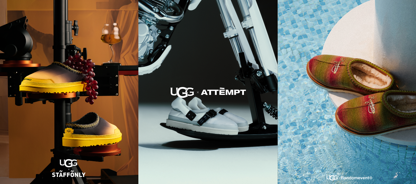 上图:UGG 首次联手三大中国本土设计师品牌 STAFFONLY(左)、ATTEMPT(中) 和 Randomevent(右),推出2023秋冬联名系列,借设计师之手挖掘品牌经典 Tasman 鞋款的多面内涵