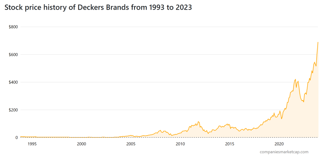 上图:过去25年 Deckers 的股价累计上涨了约88倍,截至12月6日的市值为177.6亿美元(来源:companiesmarketcap.com)
