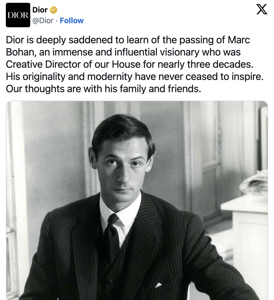 LVMH 集团首席执行官 Bernard Arnault 表示:“得知 Marc Bohan 去世的消息,我悲伤难抑。(在担任艺术总监的)近三十年的时间里,他怀着无限的敬意关注着克里斯汀·迪奥留下的巨大创意遗产,他知道如何在高级时装和成衣系列中诠释这些遗产。迪奥品牌非常感谢他,他在最初时就意识到了迪奥品牌的手工遗产和卓越技术是取之不竭的财富。如果说,法国创造力和精湛技艺的火焰如今在全世界范围内熊熊燃烧着,那这在很大程度上要归功于 Marc Bohan 耐心而持续的努力。”