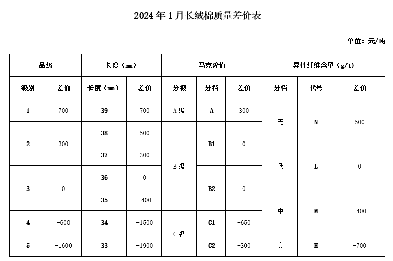 依据2023年12月的棉花公检质量数据、中国棉花协会棉花质量价差自动生成系统采集的棉花加工企业销售成交价、纺织企业监测点的采集数据以及当月的中国棉花价格指数,并征求业内相关专家的意见,与上月相比,2024年1月《中国棉花协会国产棉质量差价表》做如下调整:
